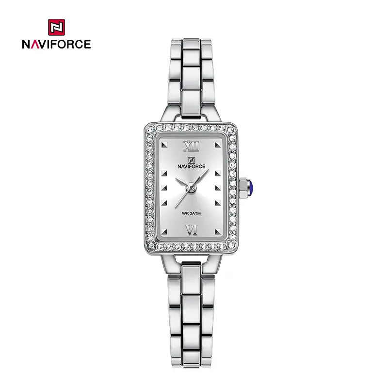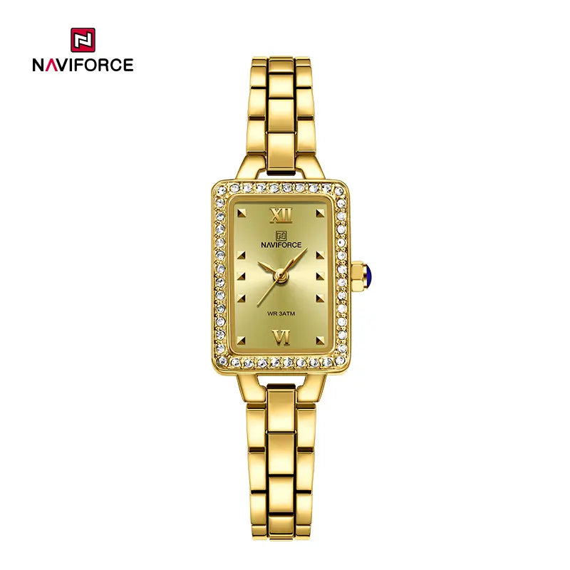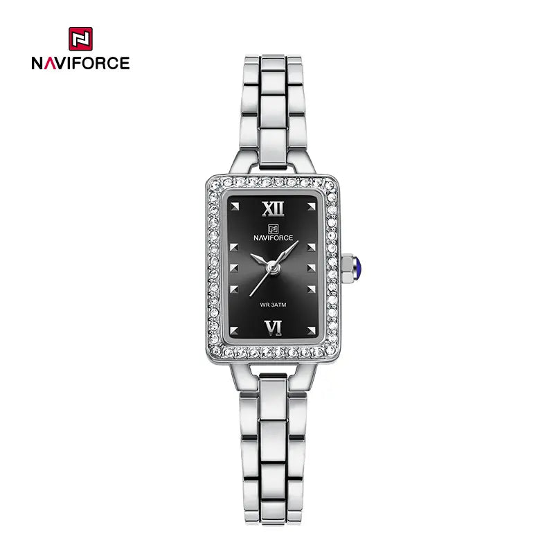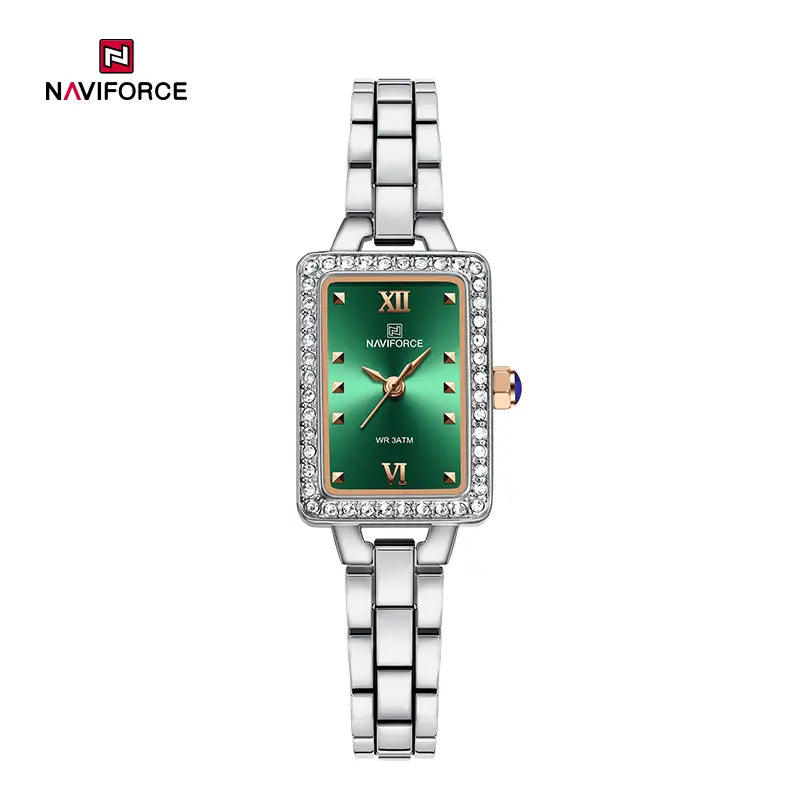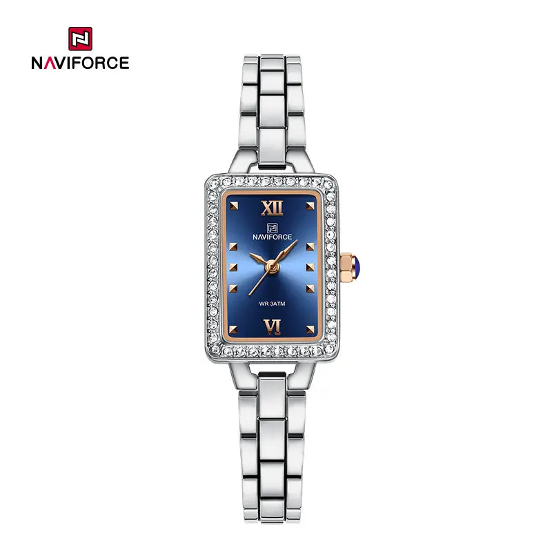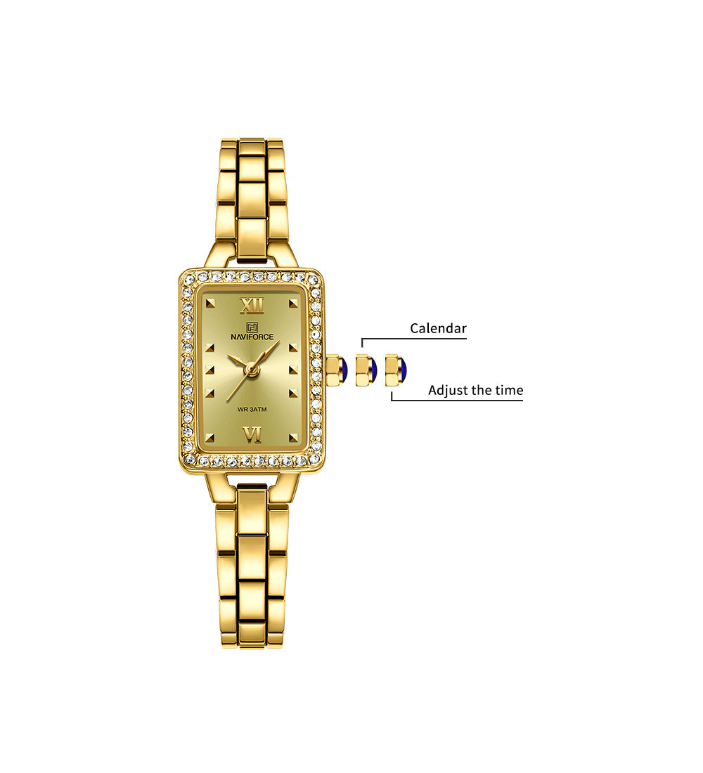 The Naviforce NF5043 watch is one of NAVIFORCE’s original premium products, featuring a geometric case design that not only showcases modernity but also exudes a unique vintage artistic beauty. The prominent Roman numerals and three-dimensional studs make it stand out in detail, full of vitality and personality. The square case adorned with sparkling diamonds adds a touch of luxury and elegance, allowing your customers to radiate a distinctive charm and become the focal point of fashion flair when wearing it.