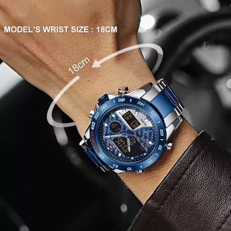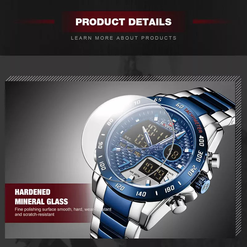 NAVIFORCE NF9171 combines bold design with practical functionality. Engineered with a reliable quartz movement, this stylish timepiece features a durable stainless steel strap, luminous dual time display, alarm, chronograph, and 30M water resistance. Its 45mm dial, hardened mineral glass, and fashion-forward design make it the perfect choice for casual, sporty, and everyday wear.