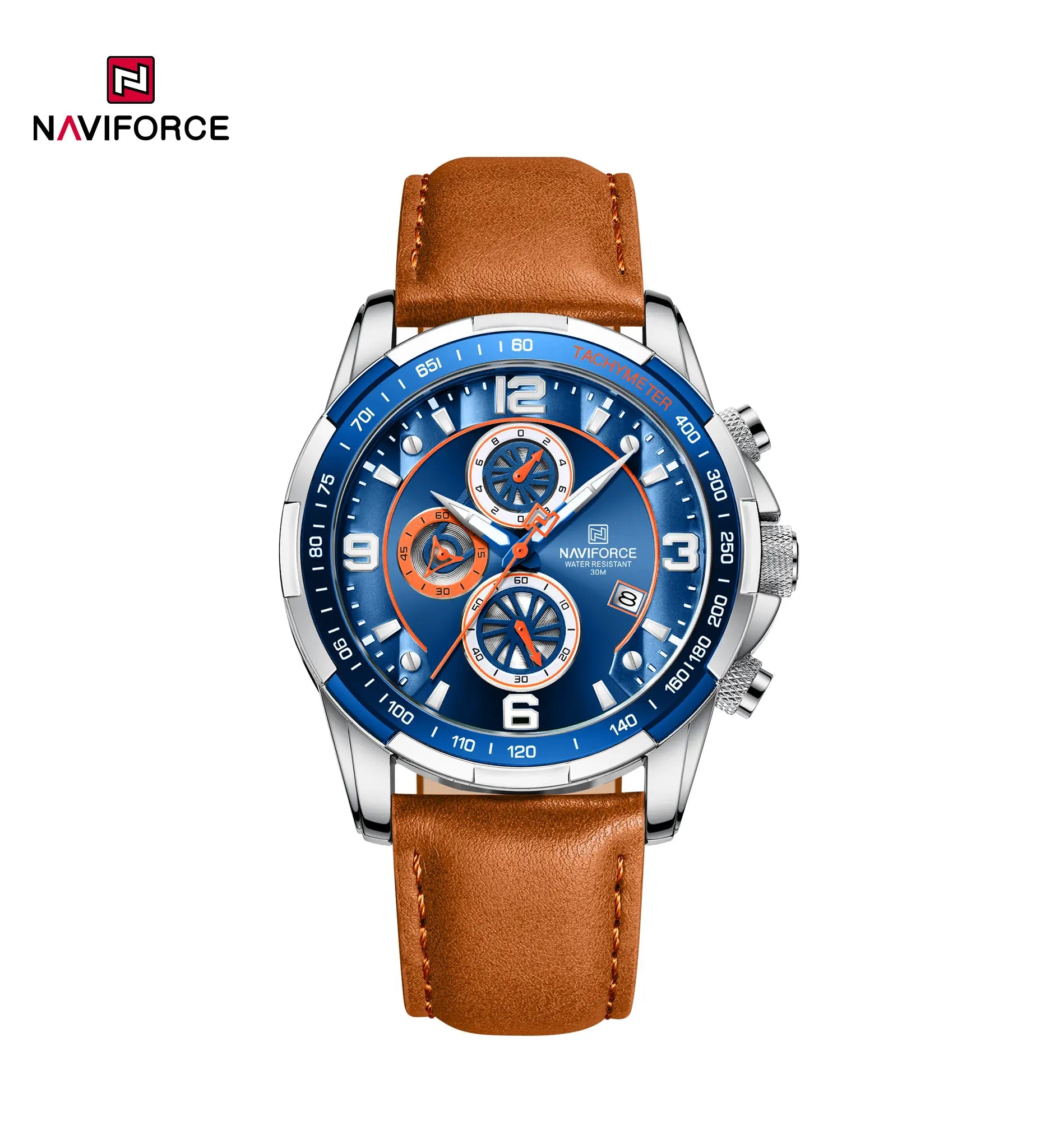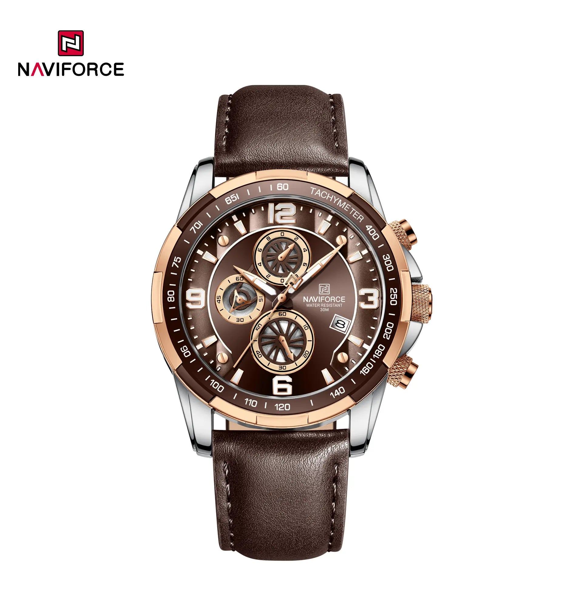 Naviforce NF8020L – A Pinnacle of Stylish Design. Experience the pinnacle of style and functionality with the NAVIFORCE NF8020L. Seamlessly integrating motorcycle elements, it features cool and stylish mechanical sub-dials for precise timing, immersing wearers in the exhilarating sense of freedom and speed. The watch boasts an endless and dominating tachymeter bezel, embodying the essence of racing and empowering individuals to transcend boundaries, unlocking maximum potential with a fervent racing spirit. Crafted from soft and captivating genuine leather, the eye-catching casual strap adds a vanguard touch to fashion statements. The adjustable pin buckle ensures embodiment of ease and freedom associated with the wind. With outstanding quartz chronograph functionality, luminous coatings for clear time reading in darkness, and 3ATM waterproof capability, the NF8020L symbolizes durability and resilience in any environment. Elevate wrist game, make a statement, and embrace the thrill of racing with NAVIFORCE NF8020L.