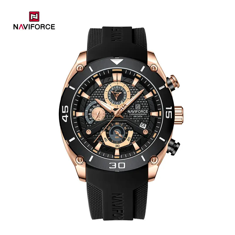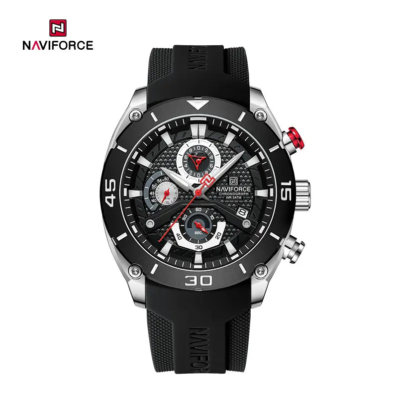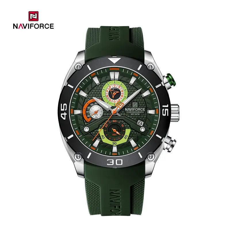 Inspired by the wild motorcycle culture, Naviforce NF8038 features a bold and avant-garde appearance, suitable for young men who dare to show themselves and pursue trendy styles. The uniquely designed multi-function chronograph small dial adds a sense of fun and is visually striking with the clever use of contrasting colors. The watch includes date and day display functions for easy timekeeping. To ensure comfortable wear, the strap is made of lightweight and breathable silicone, combined with vibrant colors to showcase personal charm. With 30 meters water resistance, it is suitable for daily life, and the luminous display ensures clear visibility in any light condition. This watch comes in 6 color options, adding vitality and passion to your daily outfits, catering to different personalities and preferences of men.
